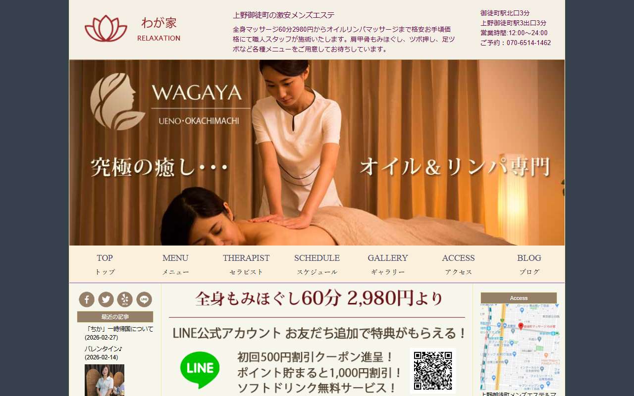 御徒町駅から歩いて5分にある中国マッサージ店「我が家」は、お店の名前の通りとっても暖かい雰囲気のお店でした。店長の気さくで明るいお出迎えがあったり、セラピストの「優ちゃん」のとっても優しい気遣いは、身体だけでなく、心までも癒されました!私の第二の「我が家」になりそうですw