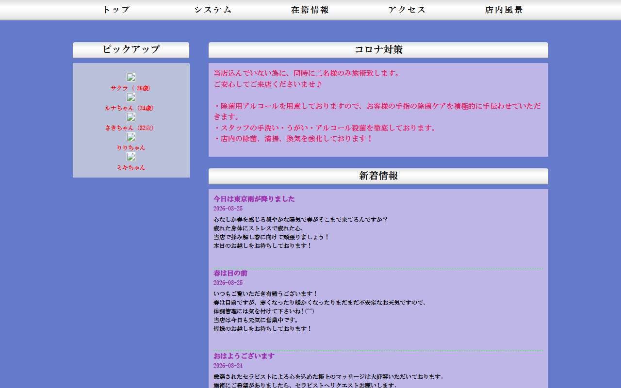 最近の口コミでは、店内の清潔さとマッサージの質が好評という声がある一方で、料金の高さやサービス内容の制限が話題になっているようです。 例えば、施術の丁寧さやリラクゼーション効果を評価する投稿が見られる一方で、追加料金や特定の行動に関する不満も指摘されています。 また、健全な運営を強調する意見が多く、…